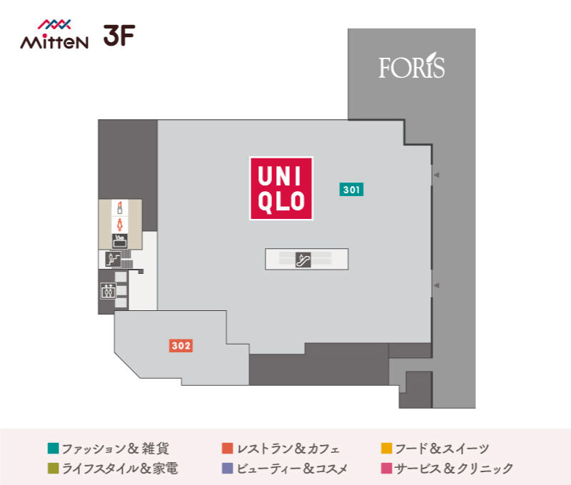 全体 ミッテン B1F 1F 2F 3F 4F 5F 6F 7F 8F 9F RF フォーリス B1F 1F 2F 3F ミッテン3F 化粧室 授乳室 府中駅 多目的トイレ 喫煙コーナー キッズトイレ ATM パウダールーム コインロッカー インフォメーション 301 ユニクロ ウイメンズ・メンズ・キッズ・ベビーファッション 050-3641-0604 10:00~20:00 302 ノースリンク コーヒーアンドティー コワークプラス カフェ+コワーク 042-610-2150 10:00~20:00